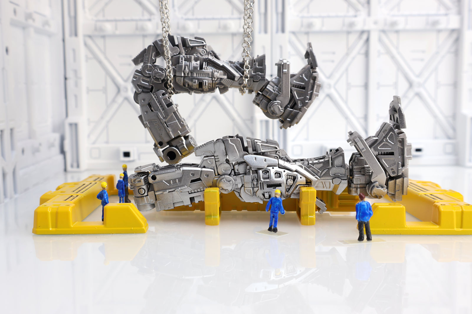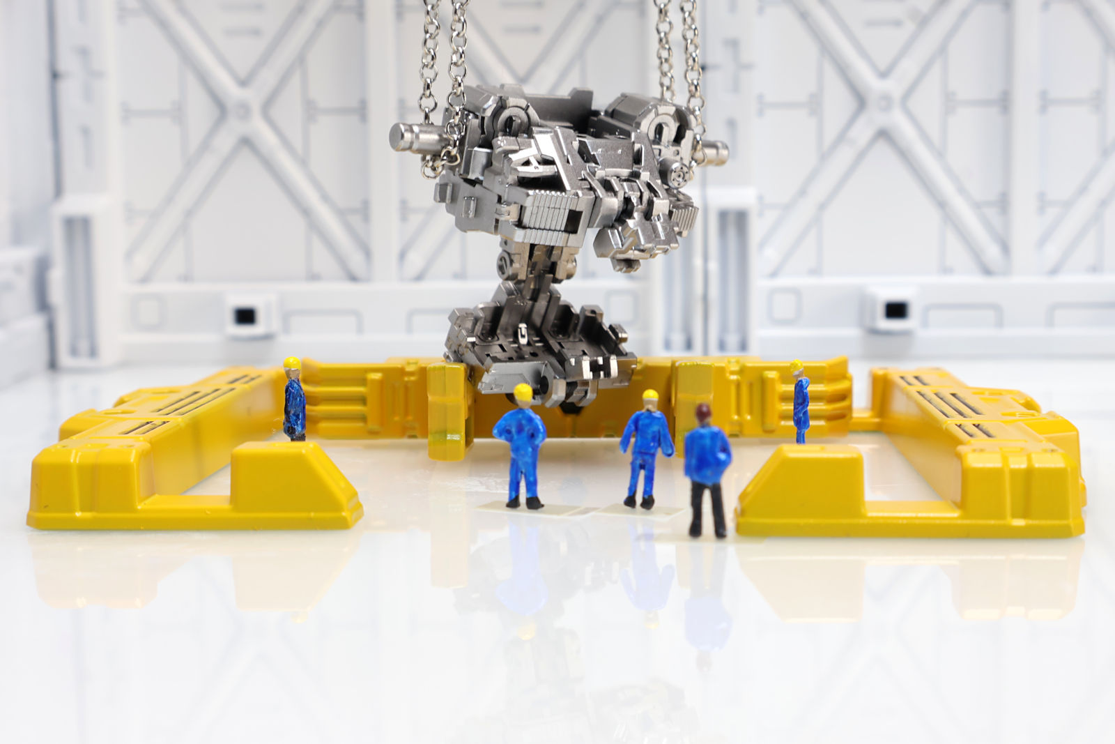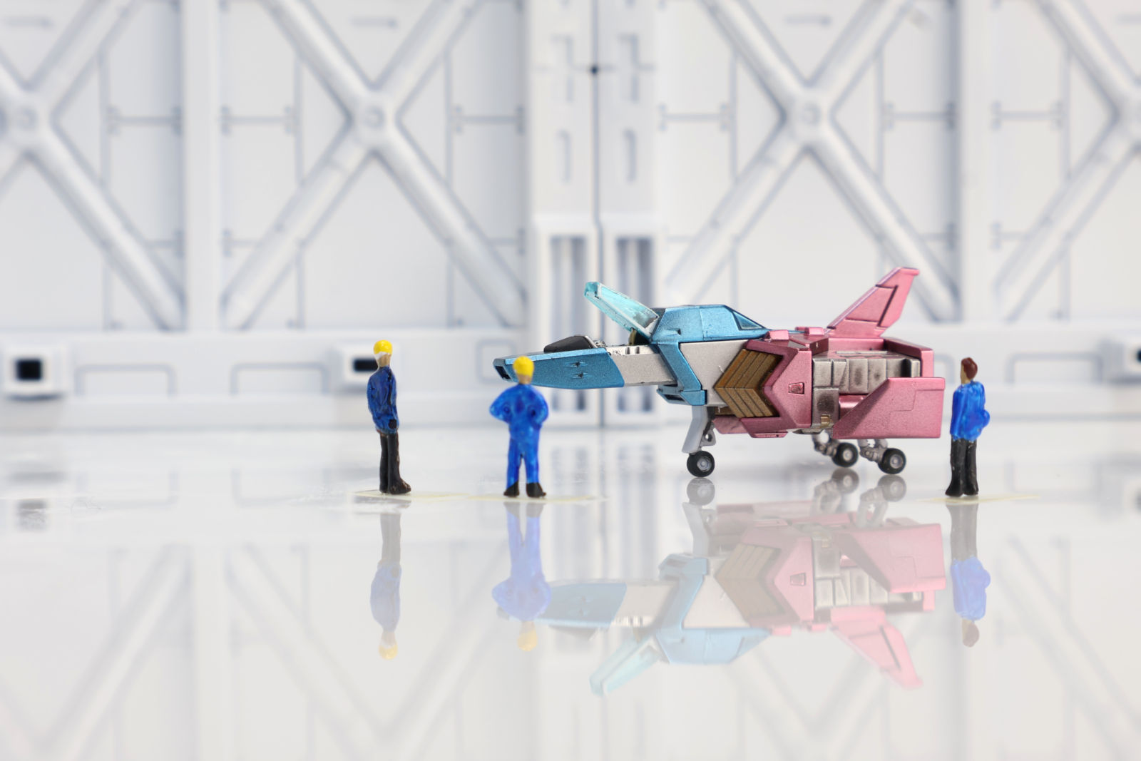 ディスプレイベースは白サフのみで、研究開発施設を表現したかったので床はプラ板(裏面に白サフ)で表現しました。鏡面のような映り込みが個人的にはとても気に入っています。