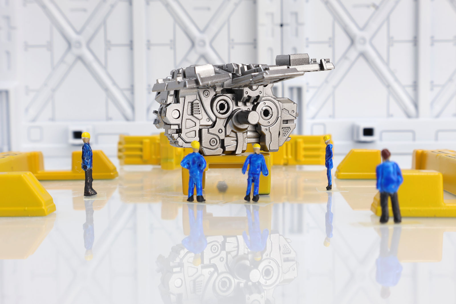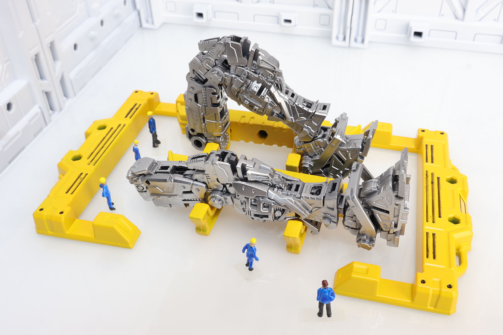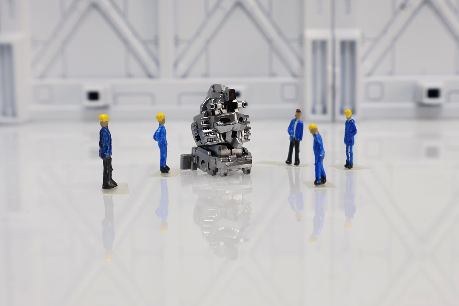 ディスプレイベースは白サフのみで、研究開発施設を表現したかったので床はプラ板(裏面に白サフ)で表現しました。鏡面のような映り込みが個人的にはとても気に入っています。