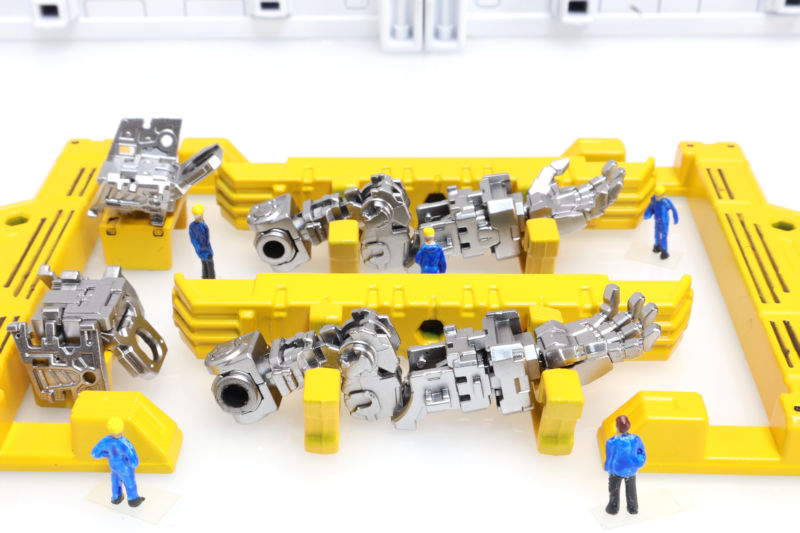 最大作業重量107t、連続作動時間220min、重量6.2t、作動自由度3+3+3DOF。アクチュエーターはリニア式と油圧式を併用しており、脚部と同様のハイブリッドアクチュエーター(HM-680405-A+)である。独立制御装置は「AE-8201fx」「AE-M5gs」、独立搭載センサは傾斜計、Gセンサ、6軸センサ、視覚カメラ。補助動力源として「LE-30」を採用。プラモではガス圧のインパクトモーターには言及されていない。